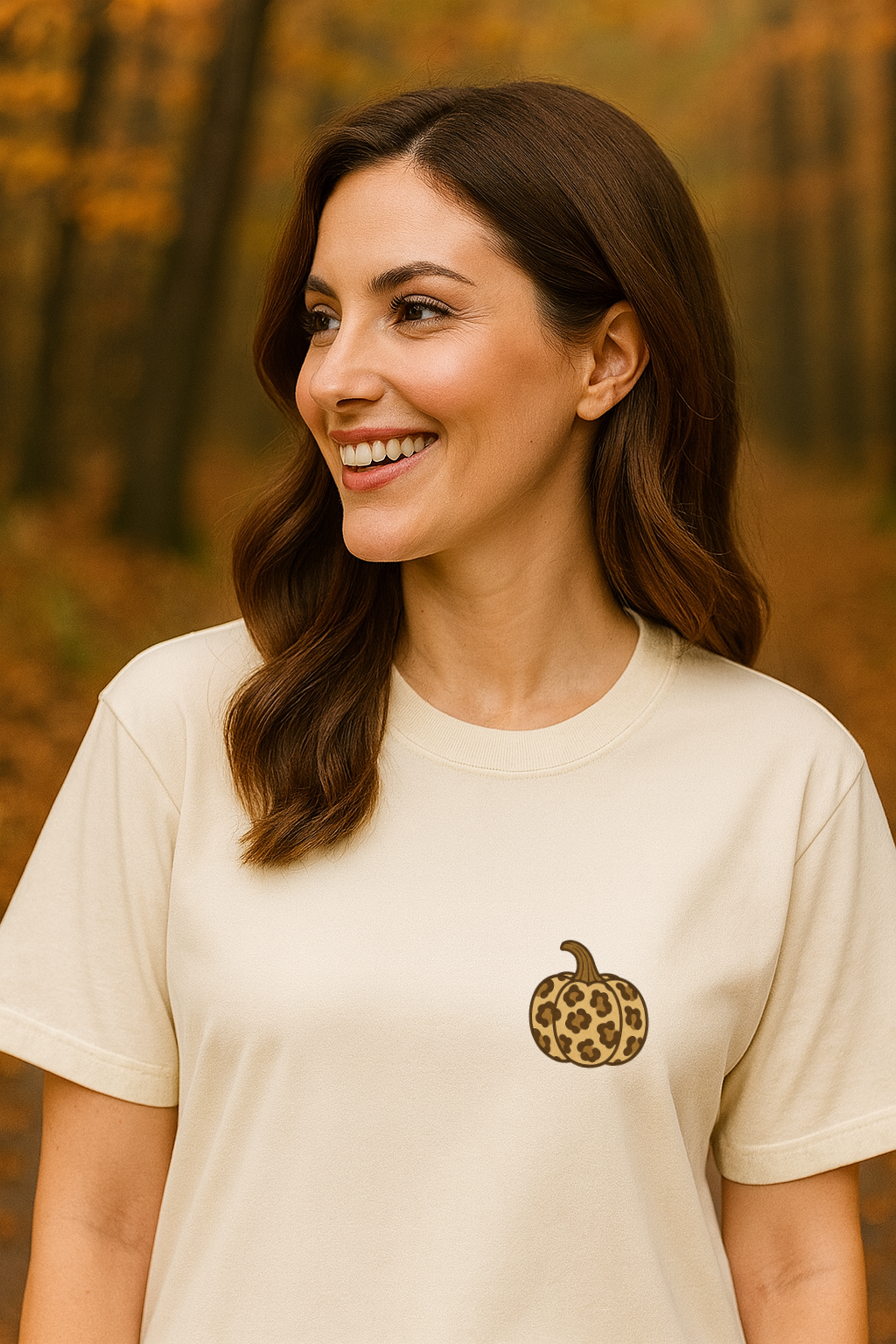 Das süße Kürbis-Motiv im trendigen Leopardendesign bringt herbstliche Stimmung und einen Hauch von Wildheit in deinen Look.